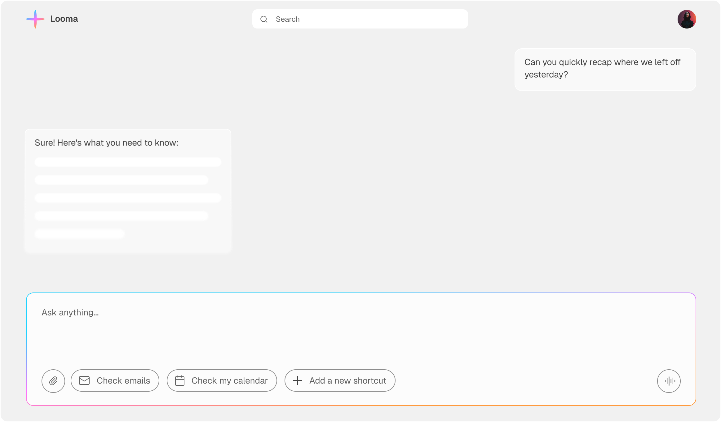 Looma connects the dots across your tools, remembers what matters, and suggests the next move all so you can move faster with less effort.